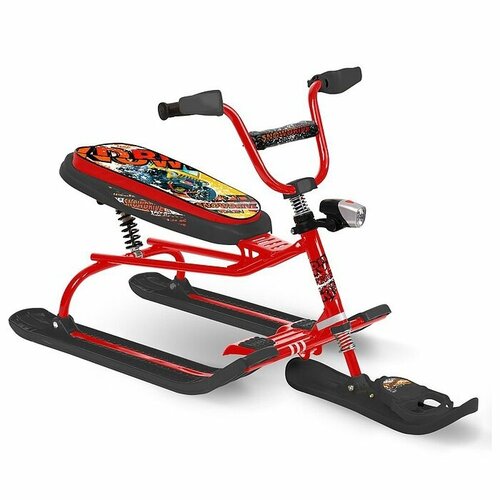 Возраст: 4–12 лет. Каркас: прочная сварная конструкция из стальных труб. Система амортизации обеспечивает комфортную поездку по крутым горкам и неровным поверхностям. Лыжи: морозостойкая пластмасса. Сиденье: мягкое, спортивное, удлинённое, обтянуто искусственной кожей. Передняя лыжа оснащена буксировочным тросом-рулеткой (верёвка не путается и удобно выдвигается). Тип руля: велоруль. Улучшенный широкий тормоз (эффективен на обледенелых поверхностях). Фонарик на каркасе (освещ
