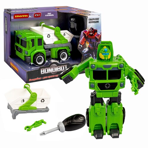 Трансформер-конструктор с отвёрткой, 2в1 BONDIBOT Bondibon, контейнерн. мусоровоз-робот, ВОХ 21х10х1