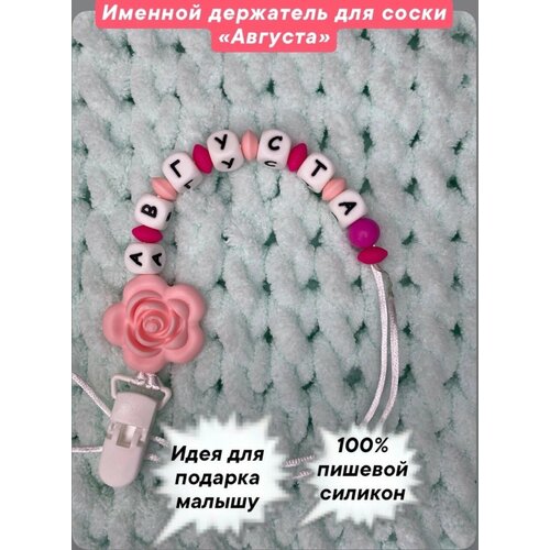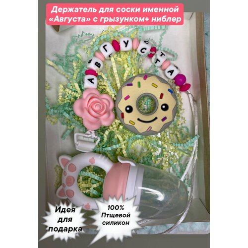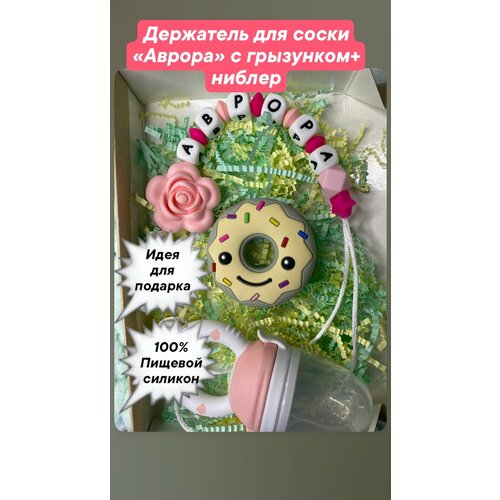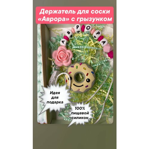 Держатель для соски именной "Аврора" с грызунком пончик + ниблер