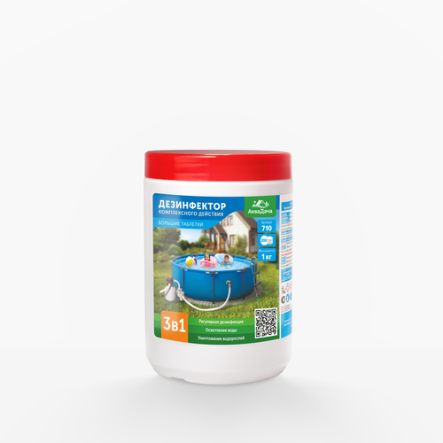 "АкваДача" Дезинфектор 3 в 1 МСХ КД (медленный стабилизированный хлор комплексного действия) табл. 200г, 1 кг (банка)