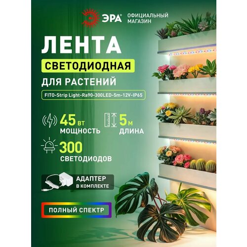 Светодиодная лента для растений рассады ЭРА FITO-Strip Light-Rа90-300LED-5m-12V-IP65 полного спектра 5 м, IP65