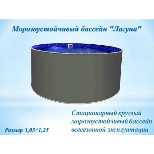 Морозоустойчивый бассейн лагуна российского производителя (г. Самара), размером 6 х 3,5 м. и высотой 1,25 м. Отлично подойдет для небольших участков и помещений. Можно использовать в качестве купели в бане.внимание: необходим предварительный монтаж опорных стен из двуполого блока или бетона.