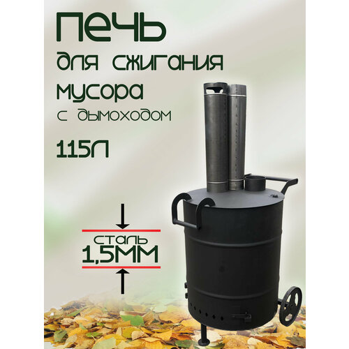 Бочка для сжигания мусора 115л с колосником и дымоходом, сталь 1,5мм