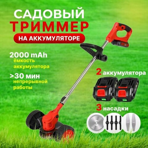 Триммер аккумуляторный для травы садовый на колесах, 2 АКБ, 8 насадок