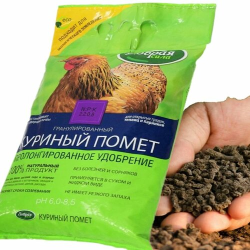 Предназначено для естественного восстановления и повышения плодородия почвы, обеспечения сбалансированного питания и формирования мощной корневой системы растений, приживаемости рассады, а также ускорения сроков созревания урожая. Для всех видов растений сада и огорода: плодовых деревьев и кустарников, овощей и декоративных растений, цветов, рассады. Куриный помет гранулированный Добрая Cила произведен по современным технологиям, которые обеспечивают важные преимущества перед обычным компостом: Удобрение не имеет резкого запаха. В процессе биотехнической обработки куриного помета уничтожаются возбудители патогенных болезней (сальмонелла, грибные заболевания, вплоть до куриного гриппа), яйца гельминтов, личинки насекомых-вредителей, семена сорных растений. При длительном хранении удобрение не меняет своих свойств. Важно! Смешивать органические удобрения (куриный помет) с золой нельзя. При смешении происходит выделение азота в виде аммиака, что значительно уменьшает эффективность внесения помета. КАК ИСПОЛЬЗОВА