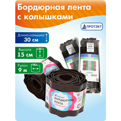 Бордюрная лента садовая, высота 15 см, длина 9 м (2 шт), с колышками (2 упак), Протэкт коричневый