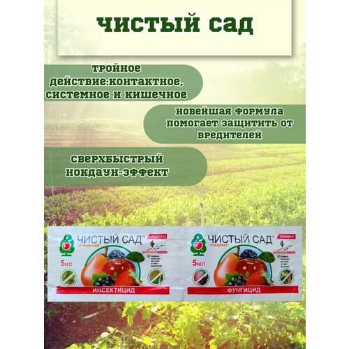 Чистый сад – высокоэффективный инсектицид и фунгицид контактно-кишечного действия для защиты плодовых деревьев и ягодных кустарников от насекомых-вредителей и болезней: яблонный цветоед, клещ, щитовки, плодожорки, листовертки, тли, медяницы и других. Препарат быстро поглощается растениями, даже при неблагоприятных погодных условиях, сохраняет активность при условии низкого уровня влажности, обладает длительным периодом защиты (до 30 дней) и высокой скоростью воздействия (в течение 30 минут после обработки вредители перестают питаться и погибают). Обеспечивает надежную защиту от вредителей основных сельскохозяйственных культур в различных условиях их выращивания. Внекорневая обработка для плодовых деревьев и ягодных кустарников (зеленая яблонная тля, сливовая тля, майский жук, яблонная медяница, грушевая медяница, яблонная плодожерка, гусень, златогуска, моли и другие): 2 пакета препарата (инсектицид+фунгицид) развести в 8-10 литрах воды, хорошо перемешать. Полученным раствором равномерно опрыскивать повер