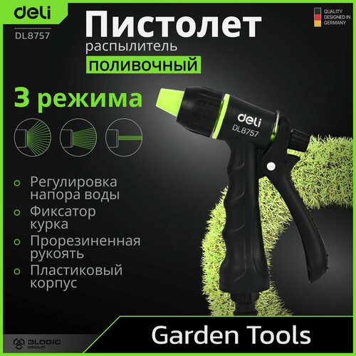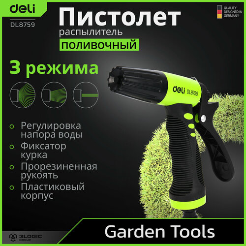 Пистолет-распылитель поливочный Deli DL8759 (3 режима распыления, фиксатор курка, прорезиненная рукоять, пластиковый корпус)