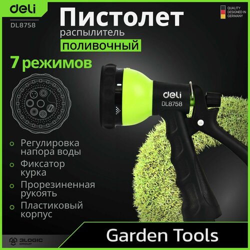 Пистолет-распылитель поливочный Deli DL8758 (7 режимов распыления, фиксатор курка, прорезиненная рукоять, пластиковый корпус)