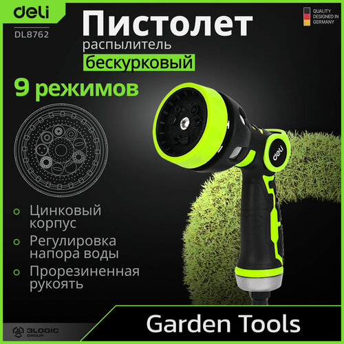Пистолет-распылитель поливочный бескурковый Deli DL8762 (9 режимов распыления, цинковый корпус, фиксатор курка, прорезиненная рукоять)