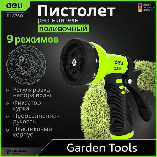 Пистолет-распылитель поливочный Deli DL8760 (9 режимов распыления, пластиковый корпус, фиксатор курка, прорезиненная рукоять)