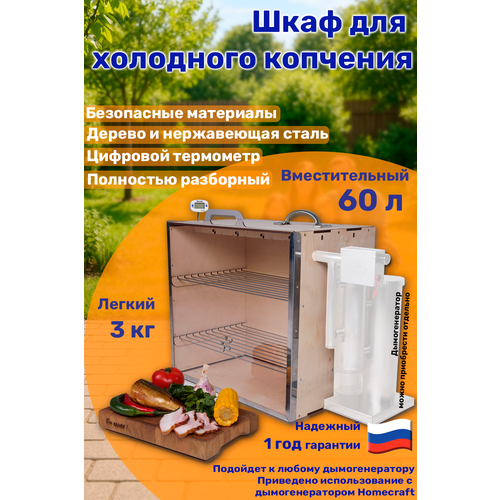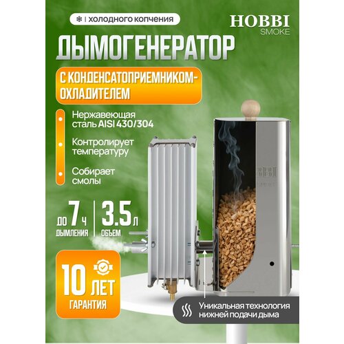 сталь, комбинированныйДымогенератор - это специальное устройство, которое создано для того, чтобы коптить рыбу, мясо, овощи, фрукты, сало и другие продукты чистым и экологичным способом. Дымогенератор Hobbi Smoke от первого в России производителя дымогенераторов холодного копчения. Благодаря нашему огромному опыту - наши изделия лишены "детских болячек" и постоянно совершенствуются. В комплект входит колба дымогенератора, компрессор, конденсатоприемник, деревянная емкость с крючками и рейками, силиконовая трубка, крепежные болты и в подарок кладем зажигалку, щепу на одну загрузку (она, как правило, лежит внутри колбы дымогенератора) и нашу фирменную книгу с рецептами. Легко разбирается и чистится. Готовьте только из качественных продуктов без химикатов и усилителей вкуса! Ведь с Hobbi smoke - это проще простого! Просто повесьте продукты в шкаф, загрузите сухую щепу в дымогенератор (важно! Влажность щепы не более 10-14%, фракция 3-7мм), подожгите щепу в емкости, включите компрессор и подождите. Вуаля! Лучшие деликатесы собственного
