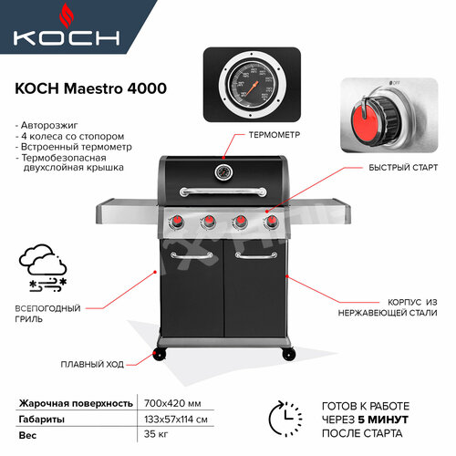 Газовый гриль Koch Maestro 4000, с термометром и автоподжигом, 133х57х114 см