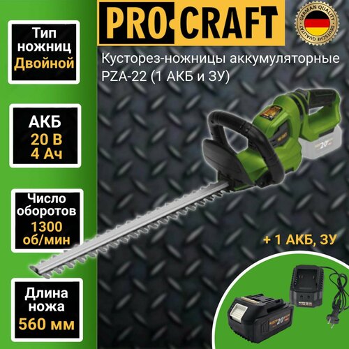 Кусторез аккумуляторный Procraft PZA22 (1 АКБ, ЗУ) 20В, 4Ач, 1300 об/мин, Длина ножа 560мм