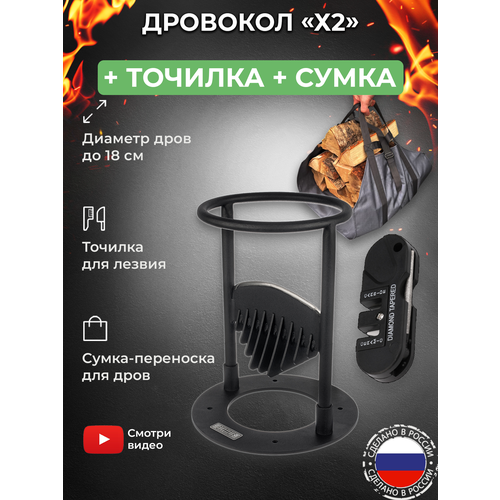 Дровокол ручной KOLUNDROV Х2 в подарочном наборе с точилкой для инструмента и сумкой для дров, стационарный колун для дров