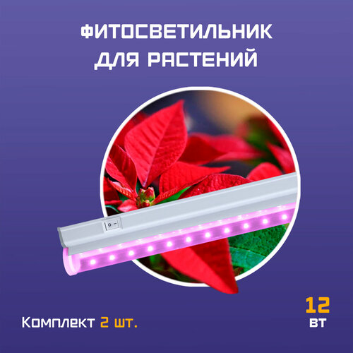 Светильник для растений линейный/Фитосветильник/Фитолампа / сине-красный спектр (фиолетовое свечение) 12 Вт 600мм / Комплект 2 шт