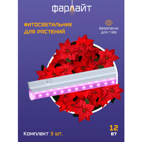 Светильник для растений линейный/Фитосветильник/Фитолампа / сине-красный спектр (фиолетовое свечение) 12 Вт 600мм / Комплект 3 шт