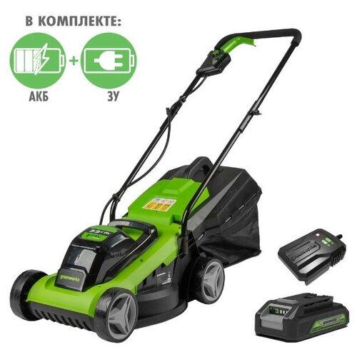 Газонокосилка аккумуляторная Greenworks G24LM32K2 24V, ширина скашивания 33 см, комплект АКБ 2 Ач + ЗУ, щеточный двигатель