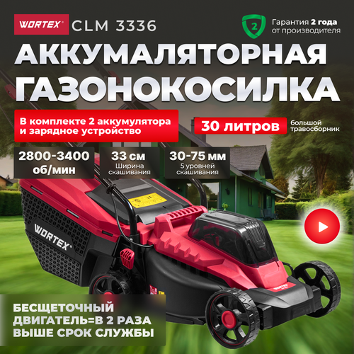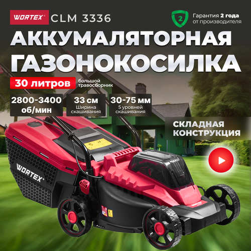 Газонокосилка аккумуляторная WORTEX CLM 3336 в кор. с акб и зу ALL1 (ширина обработки 33 см, травосборник 30 л) (0334249)