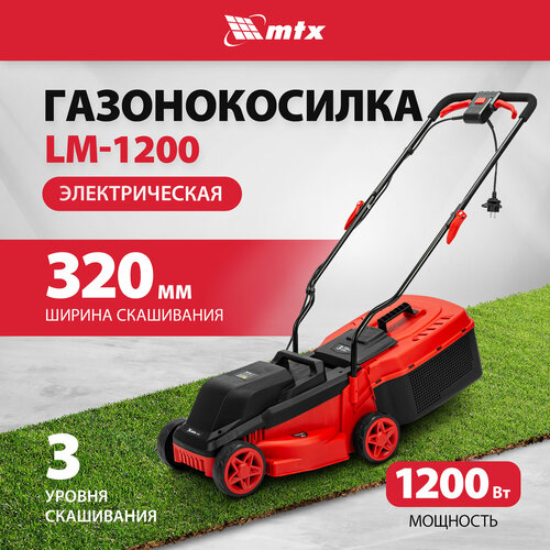 Газонокосилка электрическая MTX, LM-1200, 32 см ширина скашивания и 1200 Вт мощность, 3 уровня 25-65 мм, сбор в пластиковый травосборник 30 л, 96650