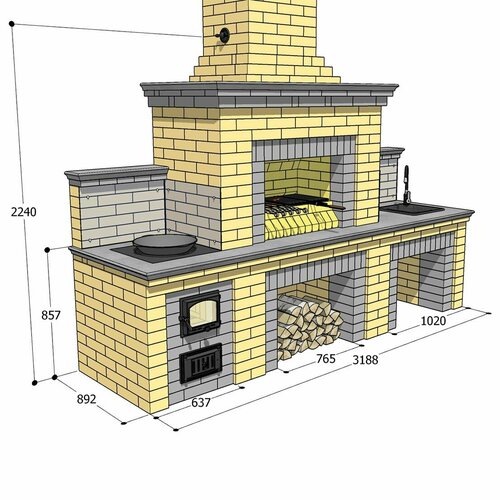 Проект "3188-П2" барбекю комплекса. Ширина мангала 770 мм. Печь с плитой под казан 6-12 л. Столешница с мойкой.
