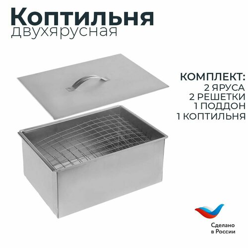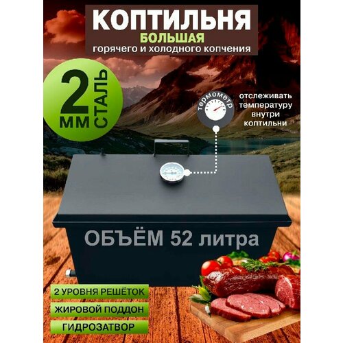 Коптильня горячего копчения, домашняя, двухъярусная, крышка с гидрозатвором, сталь 2 мм, 50х25х32 см. Горячая Сталь