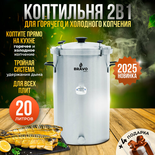 Коптильня Bravo 2 20 л, для горячего и холодного копчения, для всех видов плит, новинка 2025, нержавеющая сталь