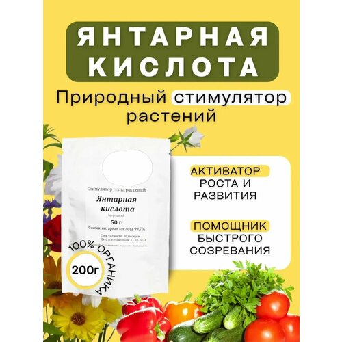 Янтарная кислота для растений сада огорода и комнатных 200г удобрение и стимулятор роста, укрепление корней и иммунитета