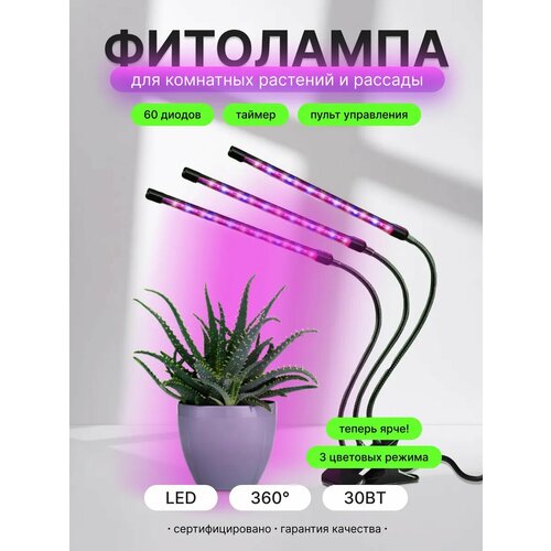Фитолампа на прищепке, 3 лампы, полный спектр, 3 х 10, 30Вт, три цвета свечения, с таймером и диммером