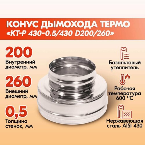 Конус Термо КТ-Р 430-0.5/430 D200/260 дымохода двухконтурный с тепловой изоляцией, сэндвич конус термо из нержавейки для дымохода