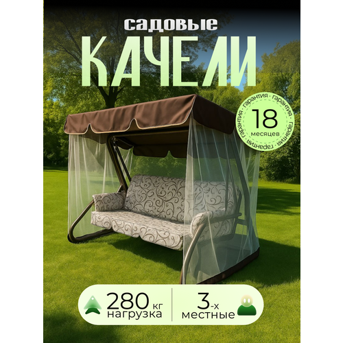 Уличные садовые качели рандеву премиум бежевый для дачи трехместные подвесные с тентом и москитной сеткой