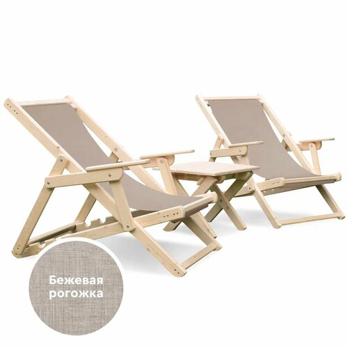 Комплект шезлонгов с бежевой тканью и подлокотниками (2 шезлонга + складной столик)