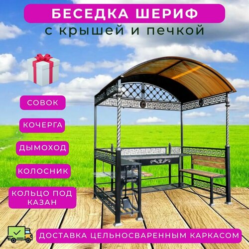 Мангал беседка "Шериф" с крышей для дачи и отдыха на природе, кованый уличный навес из стали 3 мм, с жаровней для шашлыка, печью под казан с дымоходом, стационарный, высокий, мангальная зона