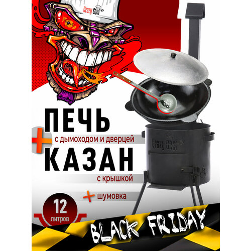 Комплект - печь из стали 3 ММ с трубой и дверцей и казан чугунный 12 литров плоское дно с шумовкой и