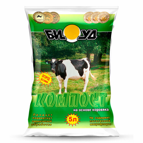 Эффективное органическое удобрение "БИУД" предназначено для активного развития плодовых, ягодных деревьев и кустарников, комнатных растений, зеленых культур, декоративных, ягодников и других растений. "БИУД-компост" прошел термическую обработку по новейшей технологии (не содержит болезнетворных бактерий, яиц и личинок гельминтов, опасны для здоровья человека) ограничений к применению не имеет. Обладает почвооздоровительным и почвообразовательным эффектом. Состав: торф низинный, коровий навоз, опилки, солома и другие органические добавки. Внимание! Не применять как готовый почвогрунт. Рекомендации к применению: весна. Внесение удобрений в почву с последующим перемешиванием: овощные в лунки 10-15 г (столовая ложка) в рядки 25-50 г (1/4- 1/2 стакана) на погонный метр. Ягодные - в посадочные ямы 0,2-0,3 кг (2-3 стакана). Фруктовые - в посадочные ямы 0,5-0,7 кг (банка 1 л). весна, лето. Подкормка любых овощных, ягодных, фруктовых культур приготовленным раствором: развести 400-500 г удобрений (3 стакана) на 8-10 л