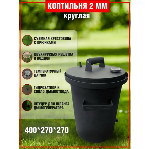 Коптильня круглая горячего и холодного копчения с гидрозатвором 2 мм (400*270*270) с датчиком температуры