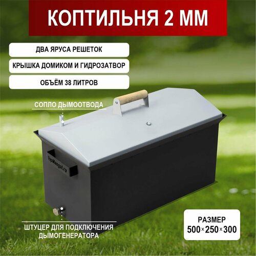 Коптильня горячего копчения 2 мм с датчиком. С гидрозатвором. Крышка домиком. Некрашенная. Размер: 500*250*250