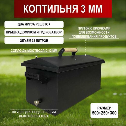 Коптильня горячего и холодного копчения TOPMANGAL с гидрозатвором с датчиком температуры 3 мм (500*250*250) черный