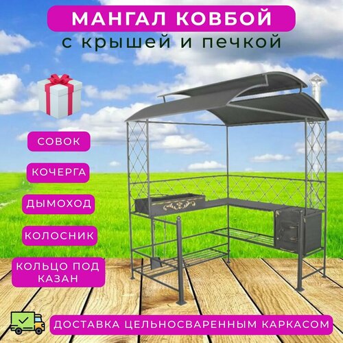 Мангал беседка "Ковбой" с крышей для дачи и отдыха на природе, кованый уличный навес из стали 3 мм, с жаровней для шашлыка, печью под казан с дымоходом, стационарный, высокий, мангальная зона