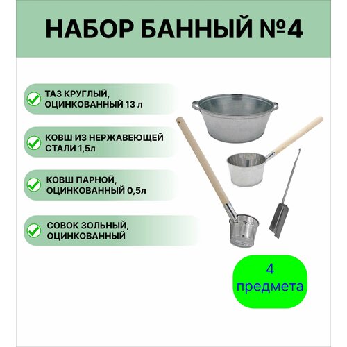 Набор для бани №4 Урал инвест Таз круглый 13 л; Ковш нержавеющий 1,5 л; Ковш оцинкованный парной 0,5 л; совок зольный