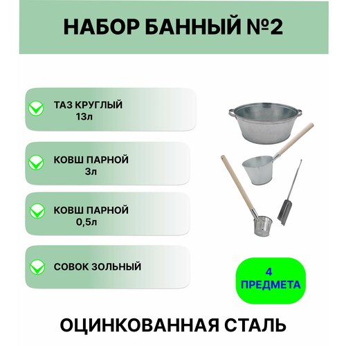 Набор для бани №3 Урал инвест таз круглый 13 л; ковш для бани, 1,5 л оцинкованный; ковш парной 0,5 л оцинкованный; совок зольный
