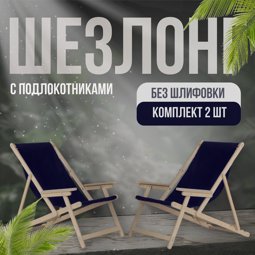 Кресло-шезлонг с подлокотниками для дома, для дачи, на пляж и пикник складной с синей тканью без шлифовки, комплект 2 шт