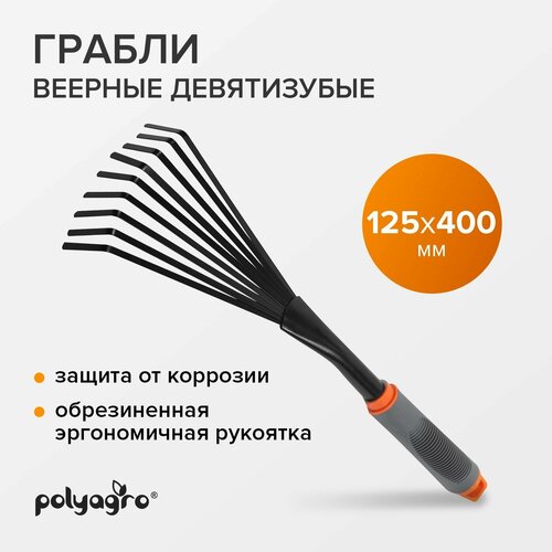 Грабли веерные, садовые, стальные 9 - зубые, с обрезиненной рукоятью, Polyagro