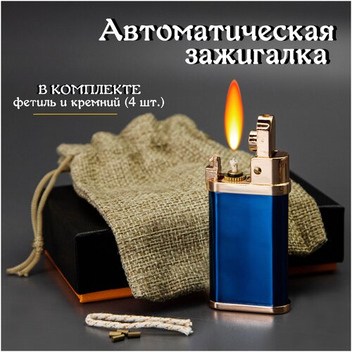 Бензиновая автоматическая зажигалка (синий глянец) + фетиль и кремний в комплекте