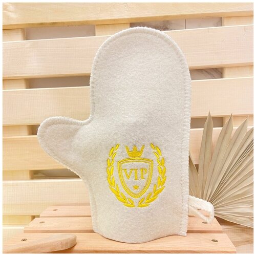 Варежка для бани и сауны, белая, из войлока с вышивкой "VIP"