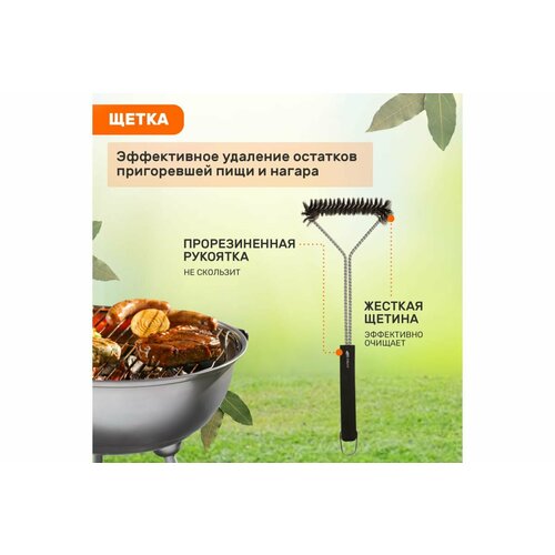 Набор подходит для мангала, барбекю, приготовления шашлыка и других блюд на огне. Универсальная щетка чистит решетки из нержавеющей стали, чугуна, хрома и фарфоровой эмали.