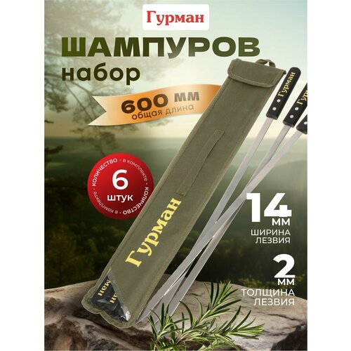 Шампур лезвие плоское, 6 шт, 600х14х2 мм, нержавеющая сталь, рукоятка дерево, Гурман, Люкс, в чехле, 23004-newblk
