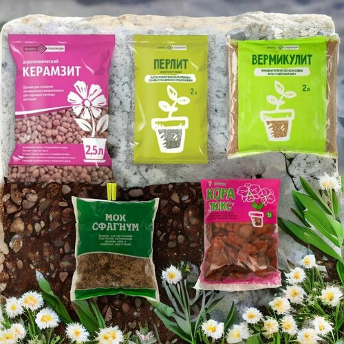 Набор влагоудерживающих добавок в грунт. Перлит 2л + Вермикулит 2л + Керамзит 2,5л + Мох сфагнум 1л + Кора Ангарской сосны 2л.
