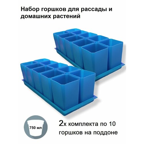 Горшки для рассады и цветов, комплект из 2-ух наборов по 10 горшков на общих поддонах (20 горшков и 2 поддона), синие
