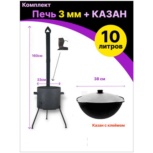 Комплект - казан чугунный 10 литров круглое дно в комплекте с печью с трубой и дверцей
